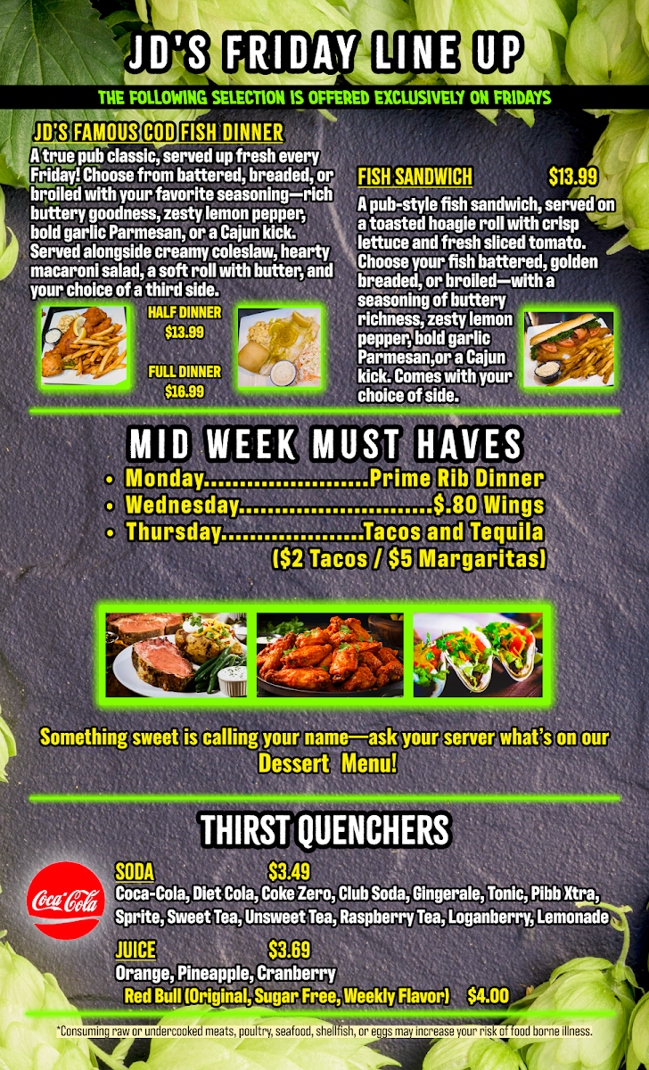 Welcome to JD's Brew Pub, a hidden gem nestled in the heart of Springville, New York. Located at 405 S Cascade Dr, this pub effortlessly combines rustic charm with a vibrant atmosphere, making it the perfect spot for food enthusiasts and casual diners alike. Whether you're looking for a relaxed lunch or a lively dinner experience, JD's Brew Pub offers a menu brimming with flavor and creativity.